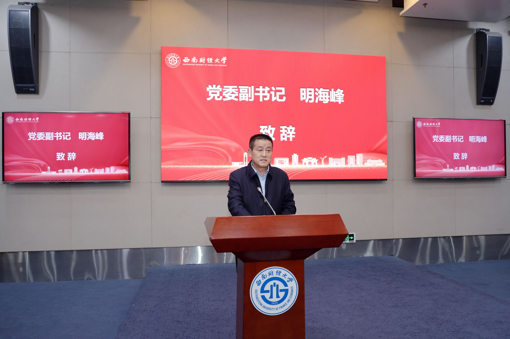 明海峰代表学校对参会嘉宾和单位表示热烈欢迎和诚挚感谢。他简要回顾了学校百年办学发展历程,重点介绍了学校近年来在人才培养、学科建设及社会服务等方面改革举措和取得的成绩。他希望校企双方以“菁融计划”为纽带,以更新育人理念、更高战略眼光,持续推进深度合作,不断开创协同育人新局面。明海峰寄语西财学子在实习实践中积累经验,丰富阅历,坚定将个人所学所研融入国家发展所需,在新征程上奋力书写优异答卷!